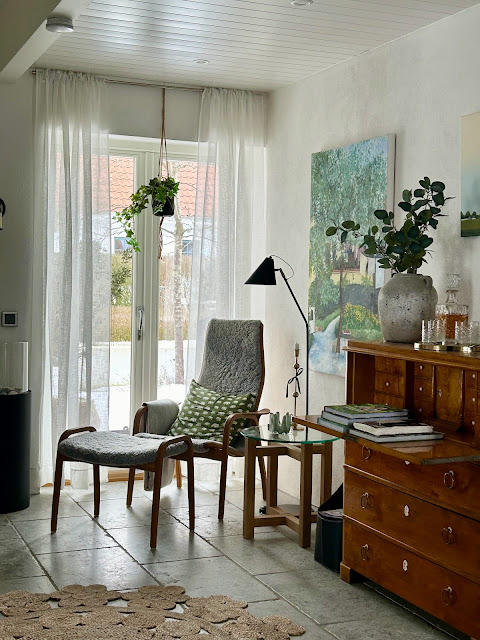 Ibland behövs det inte mycket för att ett rum ska få ett helt nytt intryck. Läshörnan här i hallen - eller "mellanrummet" som vi skämtsamt brukar kalla det - blev så mycket mysigare och här sitter man gärna och läser eller drömmer sig bort till sommar och sol. För ännu finare kommer det att bli när det är grönt utanför i trädgården och man ser blommorna på terrassen.